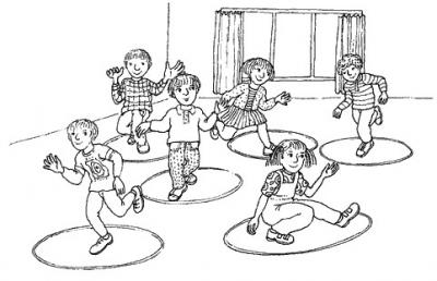 Можно не раскладывать обручи по всей комнате, а расположить их в ее центре. Можно использовать три обруча разных цветов, подобрав к ним косынки (или лоскуты) соответствующих цветов. Танцуя, участники размахивают косынками, а когда музыка смолкает, каждый находит обруч по цвету своей косынки. |