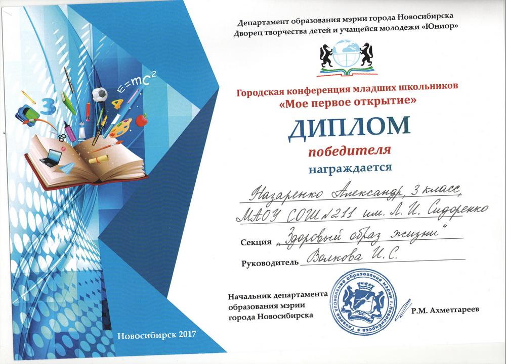 Так в 2016-2017 году работа Назаренко Александра заняла первое место в городском конкурсе научно-исследовательских работ в секции «ЗОЖ».