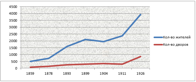 Рассматривая таблицу и диаграмму, помещенную на рисунке 3, мы видим, что количество дворов в Ордынском на протяжении 1859–1904 гг. постоянно и неуклонно возрастало. Лишь на этапе 1904–1911 гг. произошел сбой, число домохозяйств сократилось на 56 единиц. Но на последующем этапе это сокращение было с лихвой превышено новым и самым большим за весь изучаемый период приростом. За 67 лет с 1859 по 1926 г. количество домохозяйств в Ордынском увеличилась в 10,2 раза, в том числе за последние 15 лет – в 2,9 раза. Среднегодовые темпы роста количества дворов за весь изучаемый период равнялись 103,5 %.