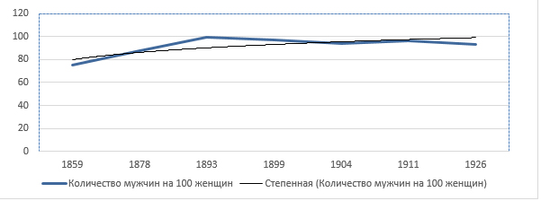 Теперь выясним, как со временем менялось количественное соотношение мужской и женской частей населения в с. Ордынском. График на рисунке 5 наглядно демонстрирует, что на протяжении всего изучаемого периода женщины численно преобладали над мужчинами, хотя большого разрыва в соотношении полов не наблюдалось. Со временем доля мужчин повышалась, о чем свидетельствует степенной тренд, и это повышение наверняка было связано с тем же переселенческим движением: семьи аграрных мигрантов и новоселов в среднем содержали больше мужчин, чем старожильческие ячейки.