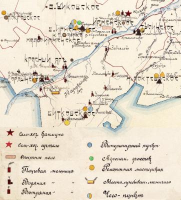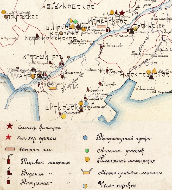 Некоторые другие элементы развивающейся хозяйственной инфраструктуры Ордынского (мельницы, ремонтная мастерская), как и окрестных приобских селений, обозначены на карте 1920 г. (рис. 6).