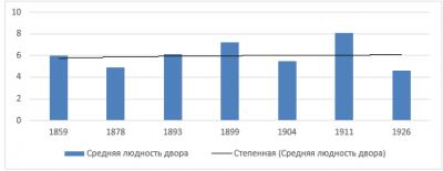 Сравнительная динамика тех двух показателей, о которых только что шла речь, влияет на трансформацию людности крестьянских дворов. Если количество домохозяйств росло быстрее численности населения, то следовало бы ожидать некоторого сокращения средней людности двора. Однако диаграмма на рисунке 4 не фиксирует такого феномена. Количество обитателей среднего ордынского домохозяйства со временем колебалось, но степенной тренд обнаруживает тенденцию к сохранению стабильности этого показателя. Этот тренд сформировался благодаря двум сильным всплескам людности, приходящимся на конец XIX в. и на период Столыпинской аграрной реформы, т. е. на этапы массового переселенческого движения в Новосибирское Приобье. Дело в том, что аграрные мигранты, поселявшиеся в Ордынском, как и во множестве окрестных деревень, имели, как правило, более многочисленные семьи, чем крестьяне-старожилы. Кроме того, в первые годы своего пребывание на новом месте многие из новоселов, не имея возможности завести самостоятельное хозяйство, приселялись во дворы к зажиточным «чалдонам». Увеличение доли переселенческих семей в общей массе деревенских дворов приводило и к росту средней людности двора (домохозяйства).