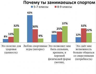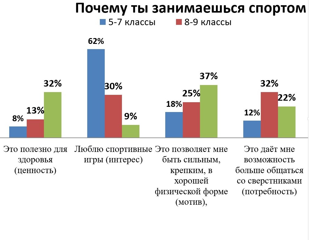 Итак, физическая культура и спорт для учащихся 5-7 классов – это прежде всего интерес; для учащихся 8-9 классов – это интерес и потребность; для старшеклассников – это мотив и ценность.
