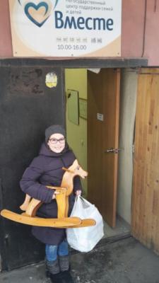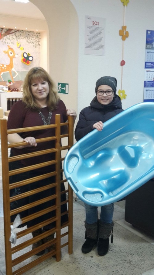 «В зимний субботний день накануне Нового года мы вместе с родителями приехали в негосударственный центр поддержки детей и семей «Вместе». Привезли туда кроватку, санки, коляску, ванночку, игрушки и вещи для мам и малышей, которые собирали всем классом. Затем отправились в социальную гостиницу "Надежда", где передали живущим там мамам и деткам памперсы и средства детской гигиены».