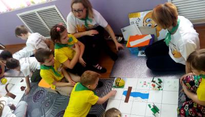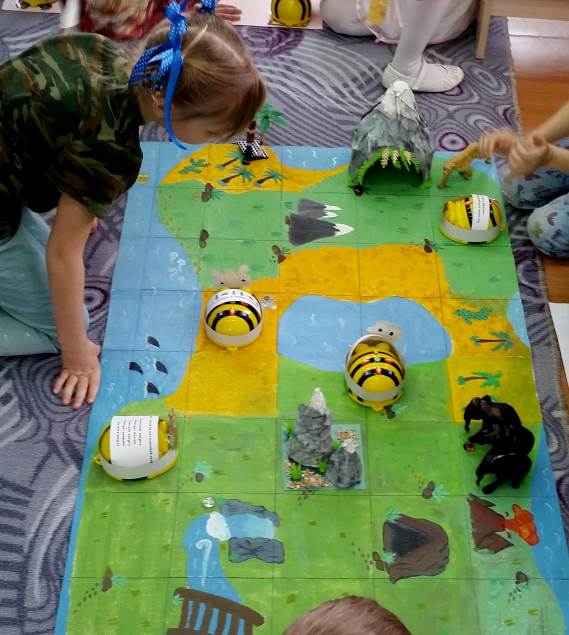Свою работу мы начинали со знакомства с «пчелками», учились ориентироваться на тематических ковриках, программировали путь пошагово, нажимая на кнопки, шагая к определенной цели, проговаривая либо ход действия «Умной пчелки», либо произнося различный речевой материал. Используя приобретенные тематические коврики, а также, совместно с воспитателями самостоятельно изготовили коврик «Путешествие по Африке» и набор масок для роботов.
