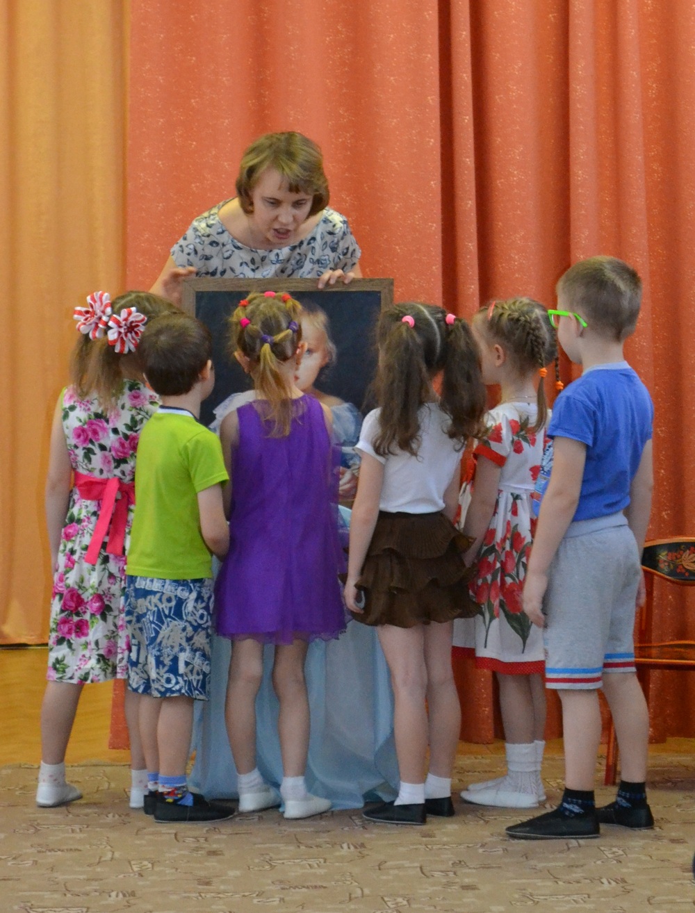 После танцевальной импровизации не акцентировать внимание детей на портрете. Если они пойдут в группу и забудут про портрет, то задать вопрос: «А как же ваш новый друг?» (Как поведут себя дети?)