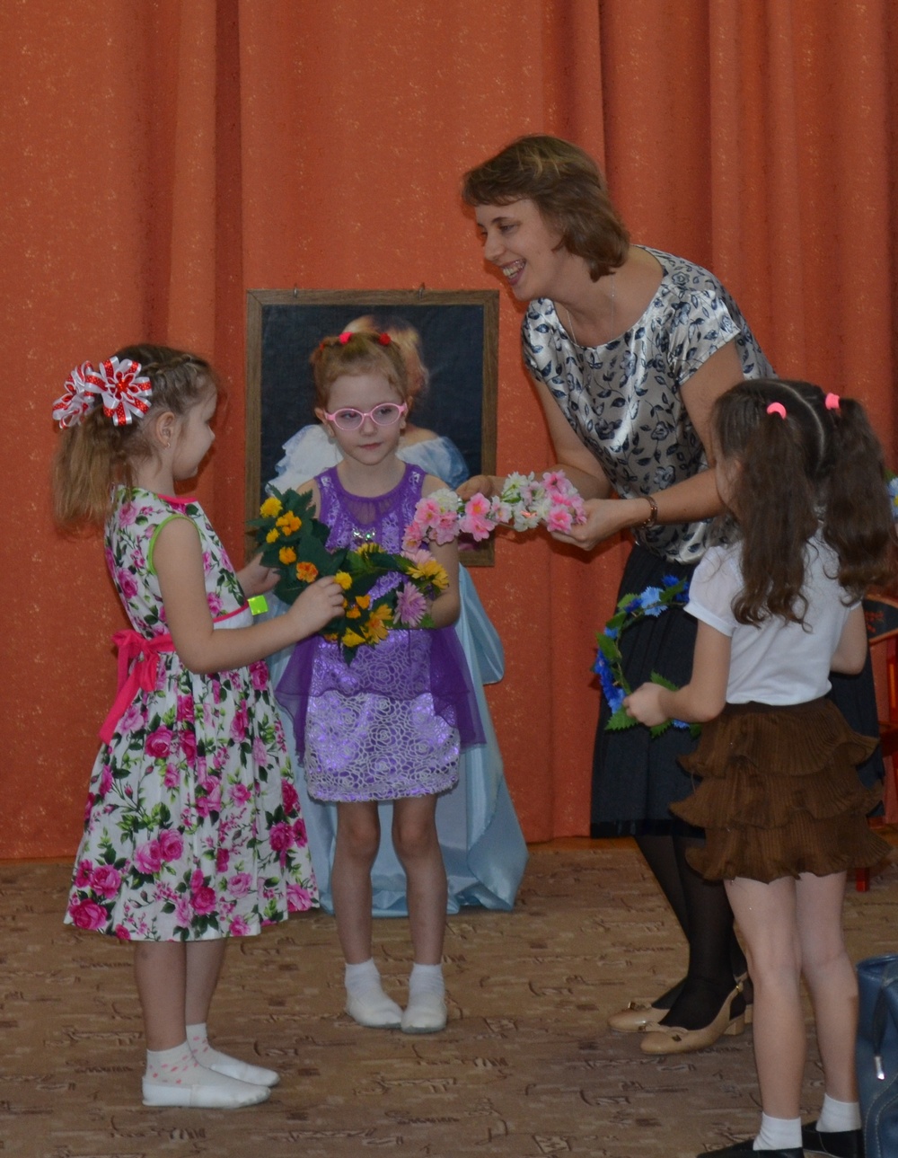 – Но, сможет ли Катя поделиться с нами венком? (…) И мы пригласить её поиграть не можем. Но сегодня для вас случится чудо. И вы сможете тоже выбрать себе венки из тех цветов, которые вам понравятся, подержать их в руках, потанцевать, отдохнуть. Вы тоже были усидчивы. А теперь отдохнем. А Катюша на вас полюбуется и порадуется.