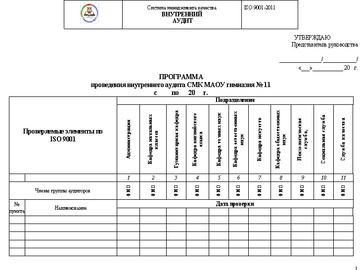 Координатором внутренних проверок СМК является представитель руководства по качеству. Следующий ответственный момент – разработка программы аудита. На этом этапе необходимо оценить имеющуюся в гимназии базу и разработать необходимые изменения. Посредством выборочной проверки документации и деятельности оценили действующую СМК, её "слабые места", объёмы доработки. После этого этапа была разработана и утверждена программа аудита СМК и руководитель каждого структурного подразделения был уведомлен под роспись о сроках проведения аудита.