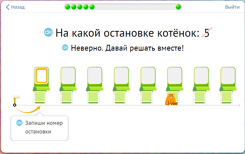 Обучение в новых образовательных онлайн-средах происходит в форме диалога с учеником во время выполнения заданий (рис.1). Некоторые системы онлайн-сред способны реагировать на действия ученика и, в случае возникновения сложности, задаёт уточняющие вопросы, которые помогают прийти к верному решению (рис. 2, 4). А в случае правильного ответа, предлагает следующее задание и хвалит обучающегося (рис. 3, 5).