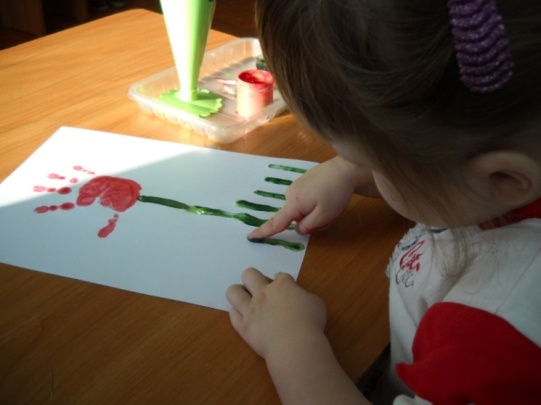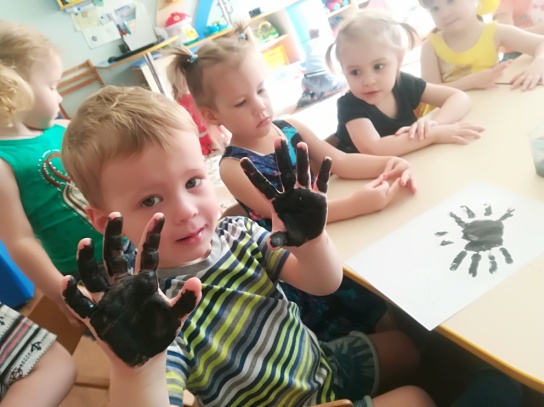 Первая техника, с которой знакомится ребенок в нашей первой младшей группе – это рисование пальчиками и ладошками. Рисунок получается очень быстро. Управлять своими пальчиками проще, чем кистью. Поэтому такое рисование увлекательней для детей. Рисуя пальцами или ладошкой, ребёнок получает удовольствие при тактильных контактах с водой, краской, бумагой. Рисование пальчиками тренирует мелкую моторику рук, и не только подготавливает кисть руки к рисованию, но и благотворно воздействует на становление мышления и речи.
