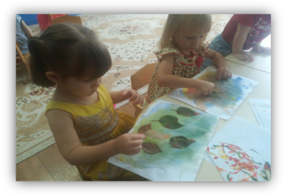 Особый восторг вызывает печать листьями. Предварительно собрав на прогулке разные листочки, в группе дети выбирают понравившиеся, красят их краской и прижимают к бумаге. С помощью листьев можно нарисовать сказочный, разноцветный лес. На бумаге хорошо отпечатается вся текстура листа, а если нанести на листок несколько красок, может получиться необычный оттенок.