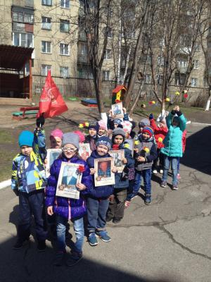 Мы не могли остаться в стороне, очень важно развивать в детях заинтересованность к действиям и событиям общественной жизни. Организовав акцию «Бессмертный полк», мы не рассчитывали на понимание детей, что это за акция. Но они хорошо запомнят общие ликование, яркие краски, смех, хорошее настроение. И хотя их ум ещё недостаточно подготовлен к оценке происходящего, впечатления уже формируют отношение к миру.