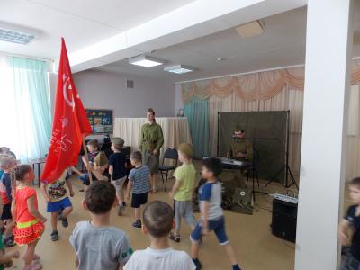 Совместно с нашим музыкальным руководителем и инструктором по физическому развитию, был организован цикл мероприятий, посвященный празднику «Великой Победы». Мы провели парад, который включал в себя военные песни: «Катюша», «Смуглянка», «Три танкиста», «Темная ночь». Кульминацией праздника стала песня «День Победы», под эту песню дети запустили в небо белые шары.