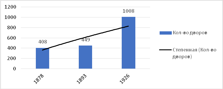 На гистограмме очевидна генеральная тенденция роста численности домохозяйств. В течение 67 лет их количество возросла в 2,5 раза, среднегодовой темп роста составил 101,3 %. Между 1878 и 1893 гг. рост численности дворов составил 100,6 % (рост числа жителей – 102, 8 %). В 1893–1926 гг. среднегодовой темп роста числа дворов составил 102,5 %, несмотря на отмеченное выше сокращение численности населения.
