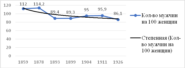 Данные «Списков населённых мест» позволяют выявить стандартное для демографических исследований соотношение мужской и женской частей населения – количество мужчин на 100 женщин. По данным «Списков населенных мест» мы построили динамический ряд соответствующих показателей применительно к Кузнецку (см. табл. 1). Теперь представим этот ряд на графике с добавленной степенной линией тренда (рис. 4).