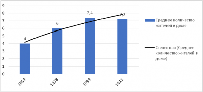 Таблица 1 содержит динамический ряд изменения среднего количества жителей в одном доме. На рисунке 2 представлена гистограмма, иллюстрирующая изменение данного показателя. Степенная линия тренда показывает последовательное увеличение среднего количества жителей дома с 1859 по 1911 г.