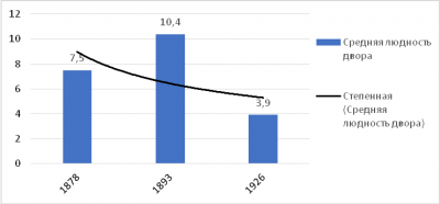 Таблица 1 содержит, среди прочего, диахронический ряд высчитанных нами показателей людности дворов в Кузнецке. Мы видим, что в 1878 и особенно в 1893 г. домохозяйства были большими по количеству их членов, однако к 1926 г. средняя людность дворов существенно снизилась. Вероятно, это было обусловлено трансформацией семейных отношений, ростом количества семей городского типа (нуклеарных). Изменения людности дворов наглядно демонстрирует гистограмма, помещенная на рисунке 3. Степенная линия тренда свидетельствует, что господствовало снижение показателя.