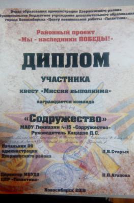 6 марта 2015 г. на основании городской целевой программы «Молодежь города Новосибирска», утвержденной начальником департамента культуры спорта и молодежной политики мэрии г. Новосибирска двое учащихся Гимназии № 15 «Содружество» при взаимодействии с «Центром гражданского, военно-патриотического воспитания «Витязь»» приняли участие в составе «Почетного Караула » Центра « Витязь » в мероприятиях, посвященных празднованию 102-й годовщины со дня рождения трижды героя Советского Союза, маршала авиации Александра Ивановича Покрышкина.