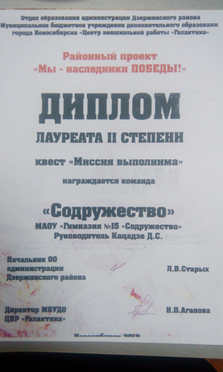 29 апреля 2016 г. в Администрации Центрального округа состоялся праздничный концерт, посвященный 71-ой годовщине Победы в ВОВ. Ученики нашей гимназии приняли активное участие в организации данного мероприятия. Пронина Мария, ученица 7 «Б» класса, рассказала стихотворение Константина Симонова «Атака». Ученица 9 «А» класса, Вера Петрухина, спела песни «Нам нужна одна победа» и «Память – наша совесть». А Немчинова Влада и Михайлова Елизавета, ученицы 7 «Б» класса, рассказали стихотворение Юлии Друниной «Зинка». Еще одним участником концерта был ученик 8 «Б» класса, Гущин Владимир с «Балладой о товарище». Помимо учеников нашей гимназии в мероприятии приняли участие студенты музыкального колледжа и ансамбль скрипачей «Ноктюрн». Слушателями были ветераны войны Центрального, Железнодорожного и Заельцовского районов.