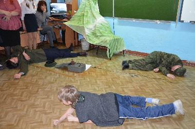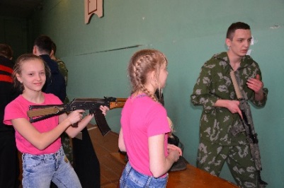 В преддверии празднования Дня Победы 19 апреля школу посетили члены военно-патриотического центра «Зенит». Целью этой встречи было знакомство с такими же подростками, как наши ребята, решившими посвятить свою жизнь защите Родины, формированию уважения к людям и их жизненной позиции, выбору профессии. Гости представили вниманию ребят разные виды оружия. Наиболее смелые и заинтересованные попробовали разобрать и собрать оружие, примеряли обмундирование. С большим интересом дети смотрели показательное выступление гостей с оружием. Все желающие получили возможность сфотографироваться в каске, в плащ-палатке, с оружием в руках.