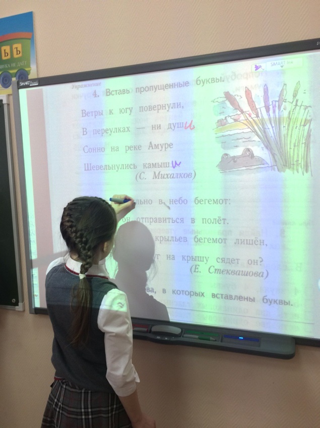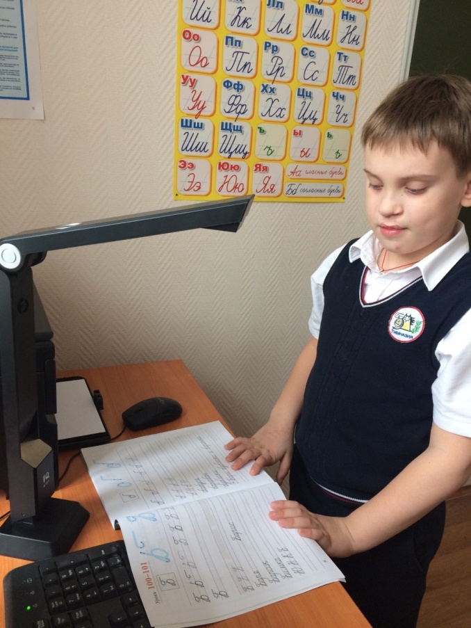 Если говорить о работе с детьми первого года обучения, то одной из главных задач учителя является научить ребят ориентироваться в прописи, учебнике, тетради. Ученикам предстоит сложная работа – умение находить нужную строку, отступать определенное количество клеток и строк. Но всё становится намного проще, когда под объективом камеры находится нужная страница пособия, проецируемая и демонстрируемая на экране доски. Осталось только показать учащимся как, что и где писать.