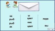 Конструктор. Работа парами. Достать конверт №1. В каждом набор частей. Из них нужно составить слова. Кто составит поднять руки ручейком. 1) рыб ка, рыб ак 2) цвет ( ы), цвет (ник) 3) пере (ход), вы (ход) ит