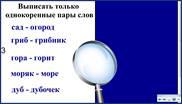 -Выписать только однокоренные пары слов. Для проверки проведём пары слов через «увеличительное стекло». Если выберите неверно, слова исчезнут. Пары слов записываем в тетрадь. Выделяем корень.