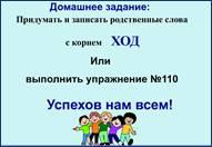 Вариант 1 Записать родственные слова с корнем ХОД Вариант 2 Выполнить упражнение №110 |