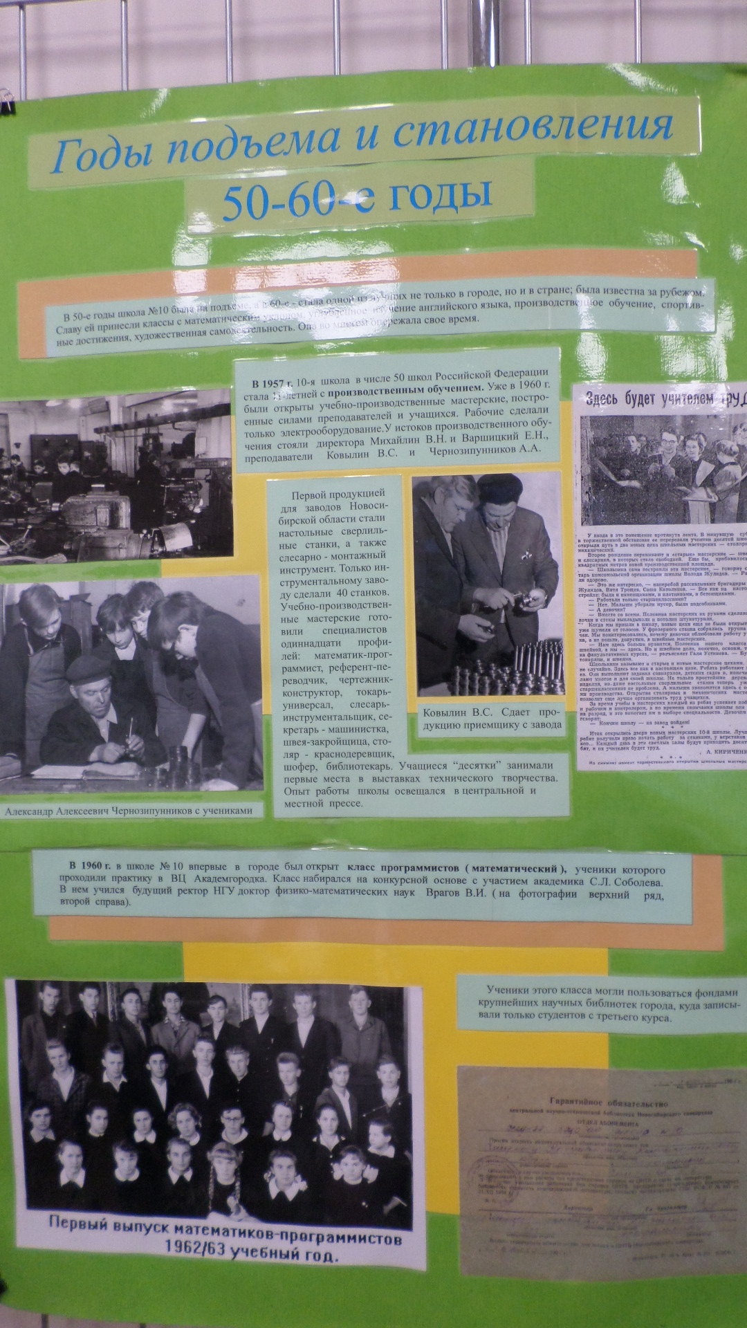 Первое событие произошло в 1957 году: 10-я школа в числе 50 школ стала 11-летней с производственным обучением, когда в школе работал настоящий детский завод и выполнялись заказы многих предприятий города, а доход составлял около миллиона рублей. В музее хранятся ходатайства предприятий на заказы. У истоков производственного обучения стояли директора Михайлин Владимир Никитович и Варшицкий Ефим Наумович. Его работа в школе – это целый мир под названием «школа Варшицкого».