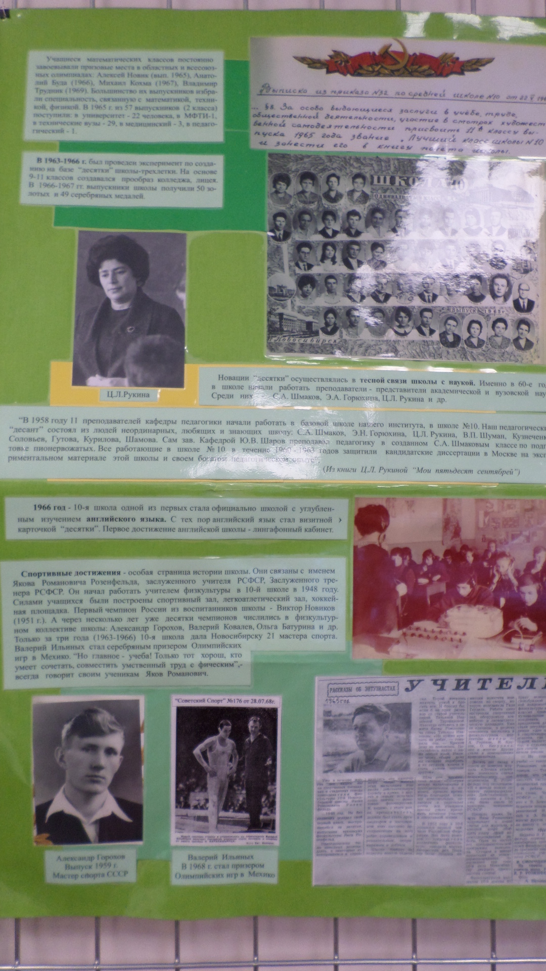Вообще спортивная слава – это особая страница в истории нашей гимназии. Она связана с именем Якова Романовича Розенфельда. Он единственный учитель физкультуры в стране, кто имеет три почётных звания: «Заслуженный тренер РСФСР», «Заслуженный учитель РСФСР», «Народный учитель России». За эти годы из школы вышли 5 Мастеров спорта международного класса, 57 Мастеров спорта страны. Среди них чемпионы и призеры Олимпийских игр, чемпионы Европы, СССР и России. 53 раза команды школы (гимназии) № 10 были победителями городской эстафеты на приз газеты «Вечерний Новосибирск» (на приз А.И. Покрышкина), учрежденной в год Победы в Великой Отечественной войне.