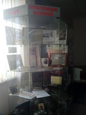 В витрине «Опаленные войной» размещены различные предметы и документы: письма и открытка с фронта, 125 гр. хлеба, которые выдавали в блокадном Ленинграде на день, книги - воспоминания участников войны, а также две поэмы о школе, авторами которых являются выпускники 1941 г. И.А. Шевчук (Розенберг) и А.С. Арбеньев, доктор технических наук: