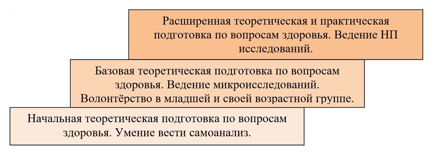 Ребята проходят три ступени, которые позволяют им развить как собственную культуру здоровья, так и повлиять на своих сверстников. На первой ступени обучающиеся получают начальную теоретическую подготовку по здоровому образу жизни, а также учатся анализировать состояние своего здоровья. Занятия проводятся как в традиционной форме, так и в виде семинаров, игр. На второй ступени школьники пополняют багаж теоретических знаний и ведут микроисследования по вопросам здоровья, приобщаются к волонтерству. На третьей ступени лицеисты занимаются научно-практическими исследованиями и волонтерской деятельностью.