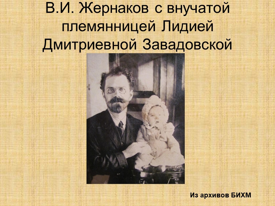 Есть еще одно место, связанное с памятью о семье Жернаковых – это Бердский историко-художественный музей. В ходе нашей исследовательской работы мы изучили ценные материалы – уникальный семейный альбом, датированный концом XIX – нач. ХХ века, хозяином которого был один из братьев Жернаковых – Илья Александрович. В альбоме более 60 фотографий, в том числе несколько фото Владимира Ипполитовича и Ольги Васильевны. Одна из фотографий имеет дарственную подпись: Дорогому дяде Илье Александровичу на добрую память от Владимира и Ольги Жернаковых. Родством Завадовских и Жернаковых объясняется наличие общих фотографий, на которых представители обеих фамилий. Организованная в нашем музее передвижная фотовыставка из цикла «Семейный альбом История с продолжением» – «Жернаковы»[25] – свидетельство сложного, наполненного тревогами и тяжелыми испытаниями времени. К каждой фотографии имеется аннотация, что очень важно для составления содержания экскурсии и знакомства с конкретным представителем обеих семей. Примечательно, что имеется фотография Владимира Ипполитовича с внучатой племянницей Лидией, нашим респондентом Лидией Дмитриевной Завадовской. В преддверии юбилея В.И. Жернакова материалы нашего музея и Бердского историко-художественного музея помогут жителям Новосибирска открыть новые страницы истории города.