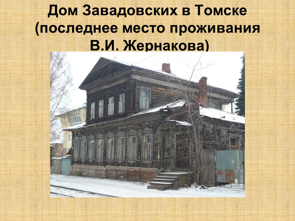 Эти факты мы установили в ходе научной экспедиции в Томск, где группа краеведов-старшеклассников, работая в Государственных архивах города, обнаружила потомков Н.А. Завадовского и В.И. Жернакова. В старинном доме, находящемся в центре Томска, состоялась встреча с их внучатыми племянницами. Это были Вера Дмитриевна Завадовская, профессор, заведующая кафедрой лучевой диагностики и лучевой терапии Томского государственного медуниверситета, и Лидия Дмитриевна Волкова, урожденная Завадовская – филолог, кандидат философских наук, преподаватель латинского языка и истории культуры.
