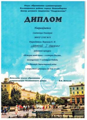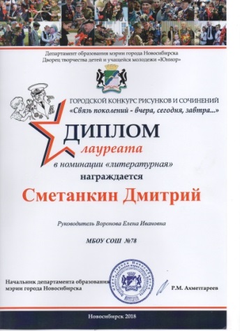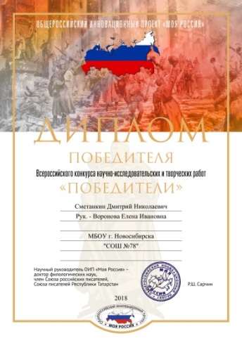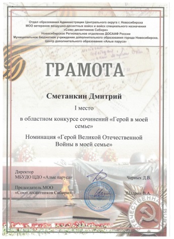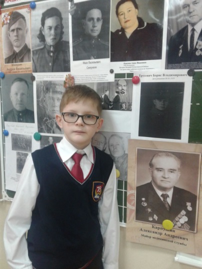В этом учебном году особенно отличился мой ученик 3 класса «В» Сметанкин Дмитрий. Он непросто рассказал своим одноклассникам о славном прошлом своего прадедушки Карпушине Александре Андреевиче, но и стал победителем во многих конкурсах на разных уровнях. Вот отрывок Димы из его работы: «Мама говорит, что прадедушка Александр Андреевич Карпушин не любил рассказывать о войне. Но пару случаев про войну он всё же рассказал, и моя мама их хорошо запомнила. Особенно про случай в окружении.