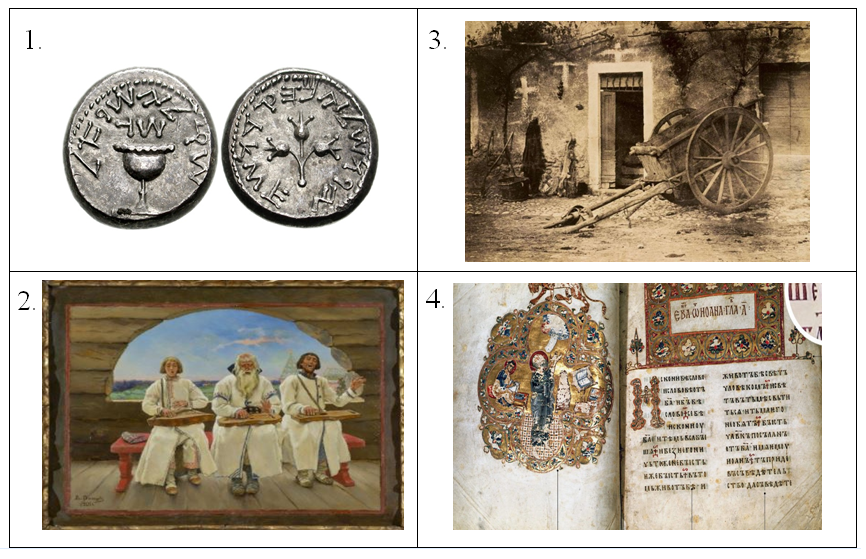(Изображения: № 1: Шекель Первой Иудейской войны. (66–71 годы н. э.). № 2: Картина Васнецова В. М. Гусляры (в данном случае необходимо обратить внимание учащихся на то, что гусляры занимались пением народных песен, былин). № 3: Фотография повозки в Бретани, датируемая примерно 1857 годом. № 4: Одна из первых рукописных книг Древней Руси – Остромирово Евангелие, написанное в середине XI века).