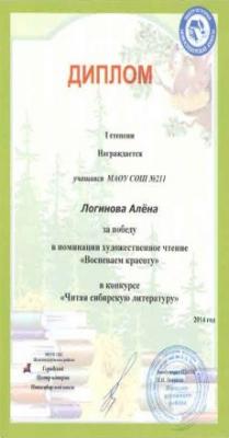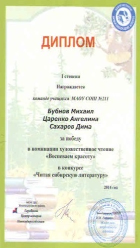 Диплом I степени (Логиновой Алёне), диплом I степени команде (Царенко Ангелине, Бубнову Михаилу, Сахарову Дмитрию) в номинации художественное чтение «Воспеваем красоту»