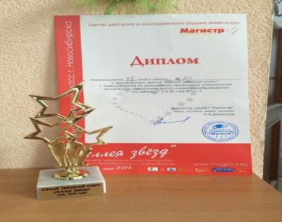 Кубок и Диплом с присвоением звания «Самый звёздный класс» г. Новосибирска по результатам проведения специальной программы личностного роста и командообразования.