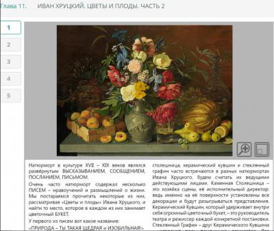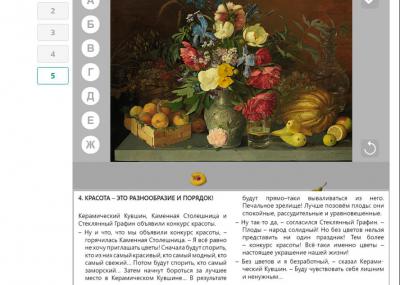 Используется система разнообразных по форме рамок, которые позволяют фокусировать взгляд на определенных деталях картины. С помощью электронной лупы можно увеличить фрагменты картины для детального рассмотрения. Электронные интерактивные инструменты (лупа, рамки для выделения фрагментов и деталей) приучают детей путешествовать по картине, учат наблюдать детали и видеть целое.