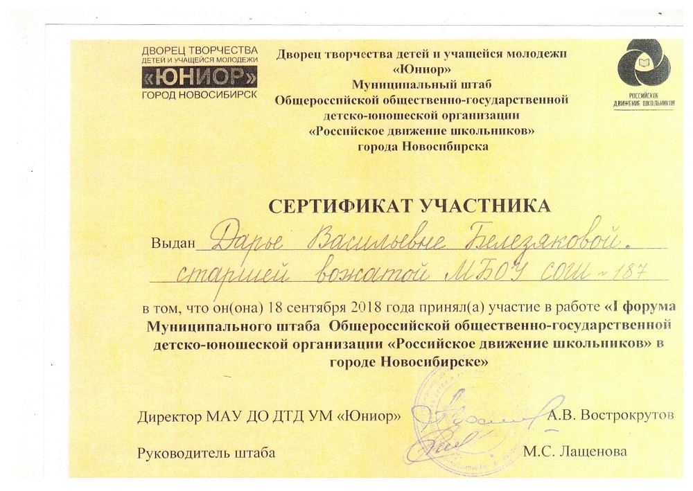 Наше школьное сообщество с сентября 2018 года вошло в состав РДШ. Куратор движения Дарья Васильевна Белезякова, молодой специалист, выпускница Киселёвского педагогического колледжа, начала активную работу по изучению опыта российского движения школьников в Новосибирске. Приняла участие в работе «I форума Муниципального штаба Общероссийской общественно-государственной детско-юношеской организации» на базе МАУ ДО ДТД УМ «Юниор». Создала электронный информационный банк для классных руководителей по РДШ, продумала формы деятельности в направлениях, заявленных в российском движении школьников.