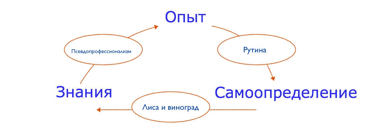Конечно, на каждом этапе этого цикла есть свои подводные камни, преодолевая которые и идёт развитие и становление личности. Так, например, на стадии знания ловушкой становится псевдопрофессионализм: это самая распространенная западня для подростков. «Я научился щелкать затвором камеры, я всё могу и умею». Такие ребята начинают работать «одной левой», снисходя до тех заданий, которые получают. Результат, как правило, плачевен. Для выявления у себя симптомов псевдопрофессионализма достаточно несложной рефлексии: а не «прилетает» ли мне в последнее время на пустом, вроде бы, месте?