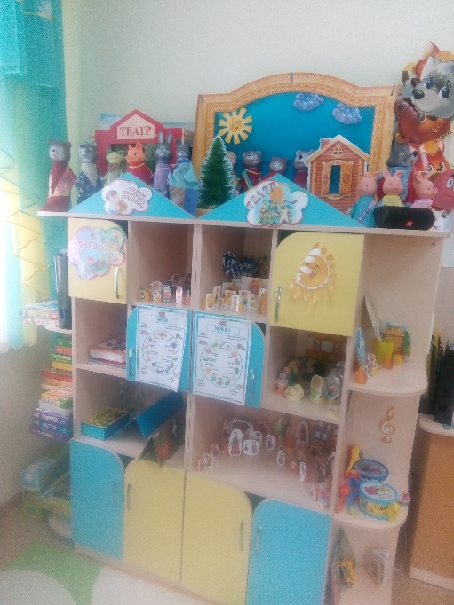 В уголках «Театрализации» и «Речевого развития» размещаем материал по изучаемым темам, который позволяет поддерживать и развивать познавательную активность дошкольников. Игровой и наглядный материал периодически меняем в соответствии с темой недели, появляются новые предметы, стимулирующие двигательную, игровую, исследовательскую и познавательную активность детей.