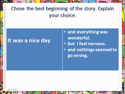 4. Учащимся предлагаются фразы начала рассказа и несколько опций на выбор, с просьбой объяснить свой выбор (работа в группе).