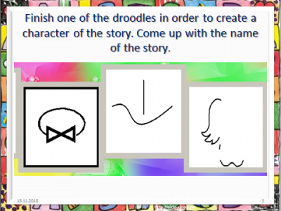 3. Учащимся раздаются листы с друдлами и предлагается дорисовать один из них, создав персонаж своего будущего рассказа, придумать имя персонажа и название и для рассказа (на английском языке)