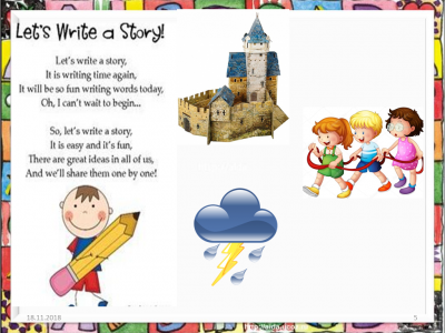 Учитель предлагает учащимся представить себя сотрудниками редакции, а себя – капризным редактором. Журналу срочно требуется интересный рассказ. Редактор предлагает сотрудникам написать такой рассказ, опираясь на несколько предложенных картинок и включив в него ранее придуманный персонаж. Но когда учащиеся начинают работать, каждые несколько минут добавляет требование включить новый персонаж (работа в группах).