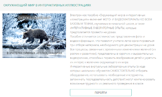 2 направление – «Окружающий мир в интерактивных иллюстрациях». В журнале 5 глав, на данный момент в 1 главе «Разнообразие животных» опубликованы различные фото и видео материалы о животных. Это пособие расширяет пространство и учебника в печатной форме, и учебника в ЭФ, и тех пособий, которые уже вышли. У учителя есть возможность не тратить время на поиски в Интернете, а использовать уже готовые иллюстрации, видео, музыкальное сопровождение, позволяющие расширить образовательное пространство ребенка по знакомству с животными и средой их обитания. Система иллюстраций составлена таким образом, что есть возможность посмотреть в объеме 3D и под микроскопом тех или иных животных с разных ракурсов, чтобы у ребенка возник визуальный образ.