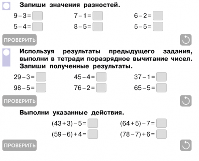 На уроках математики в ходе работы с ЭФУ отрабатывается тренировка вычислительных навыков с автоматической проверкой и тестированием. Интерактивные задания способствуют формированию таких регулятивных УУД, как планирование – составление плана и последовательности действий, и прогнозирование – предвосхищение результата и уровня усвоения знаний, в удержании учебной задачи. И таких познавательных УУД как материализация действия (классификация, упорядочение объектов, выделение существенных признаков понятий); и алгоритмизация выполнения заданий в интерактивной форме.