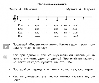 В ЭФУ музыки на каждой странице есть и музыкальное произведение, которое вначале профессионально исполняет артист, и дана инструментальная фонограмма, с помощью которой ребенок может самостоятельно, ориентируясь на образец исполнить произведение.
